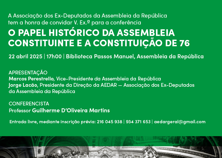 A AEDAR - Associação dos Ex- Deputados à Assembleia da República - organizou no passado dia 22 de Abril de 2025, na Biblioteca Passos Manuel, na Assembleia da República, uma Conferência intitulada "O papel histórico da Assembleia Constituinte e a Constituição de 76 " com Guilherme d'Oliveira Martins como orador.