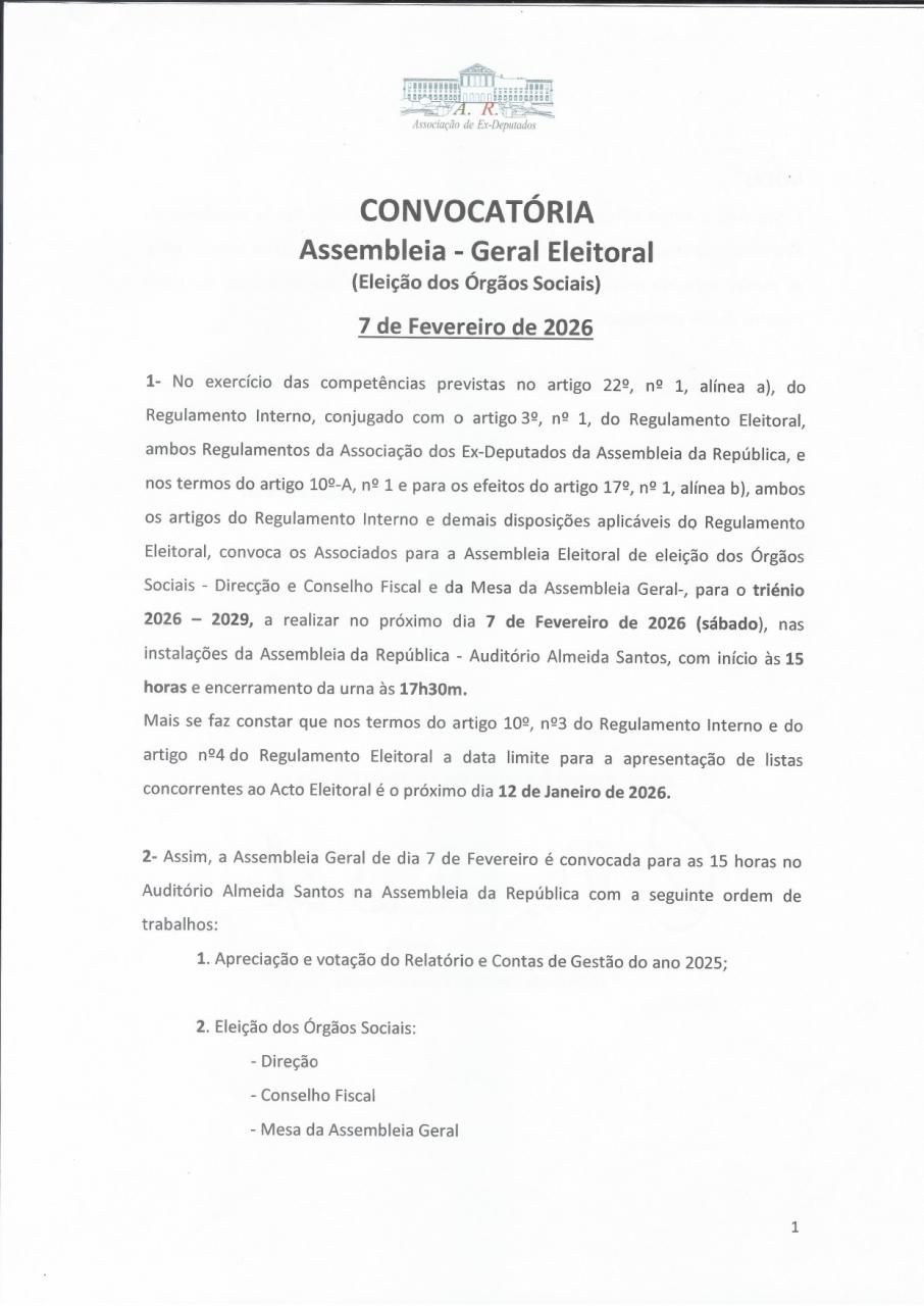 1- No exercício das competências previstas no artigo 22º, nº 1, alínea a), do Regulamento Interno, conjugado com o artigo 3º, nº 1, do Regulamento Eleitoral, ambos Regulamentos da Associação dos Ex-Deputados da Assembleia da República, e nos termos do artigo 10º-A, nº 1 e para os efeitos do artigo 17º, nº 1, alínea b), ambos os artigos do Regulamento Interno e demais disposições aplicáveis do Regulamento Eleitoral, convoca os Associados para a Assembleia Eleitoral de eleição dos Órgãos Sociais - Direcção e Conselho Fiscal e da Mesa da Assembleia Geral-, para o triénio 2026 – 2029, a realizar no próximo dia 7 de Fevereiro de 2026 (sábado), nas instalações da Assembleia da República - Auditório Almeida Santos, com início às 15 horas e encerramento da urna às 17h30m.