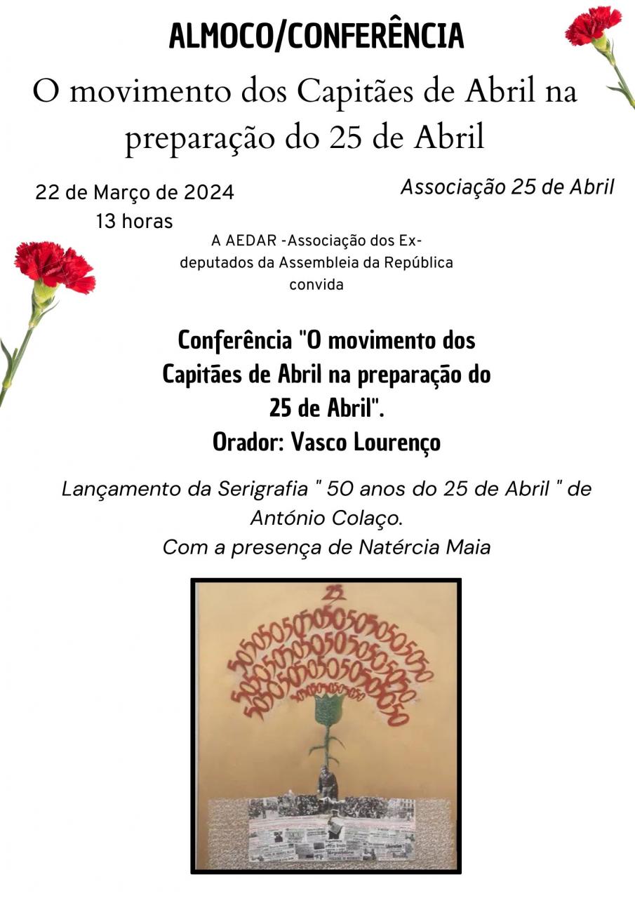 No âmbito das nossas comemorações dos Cinquenta anos do 25 de Abril a AEDAR organizou um almoço/conferência a ter lugar no dia 22 de março de 2024 na Associação 25 de Abril.