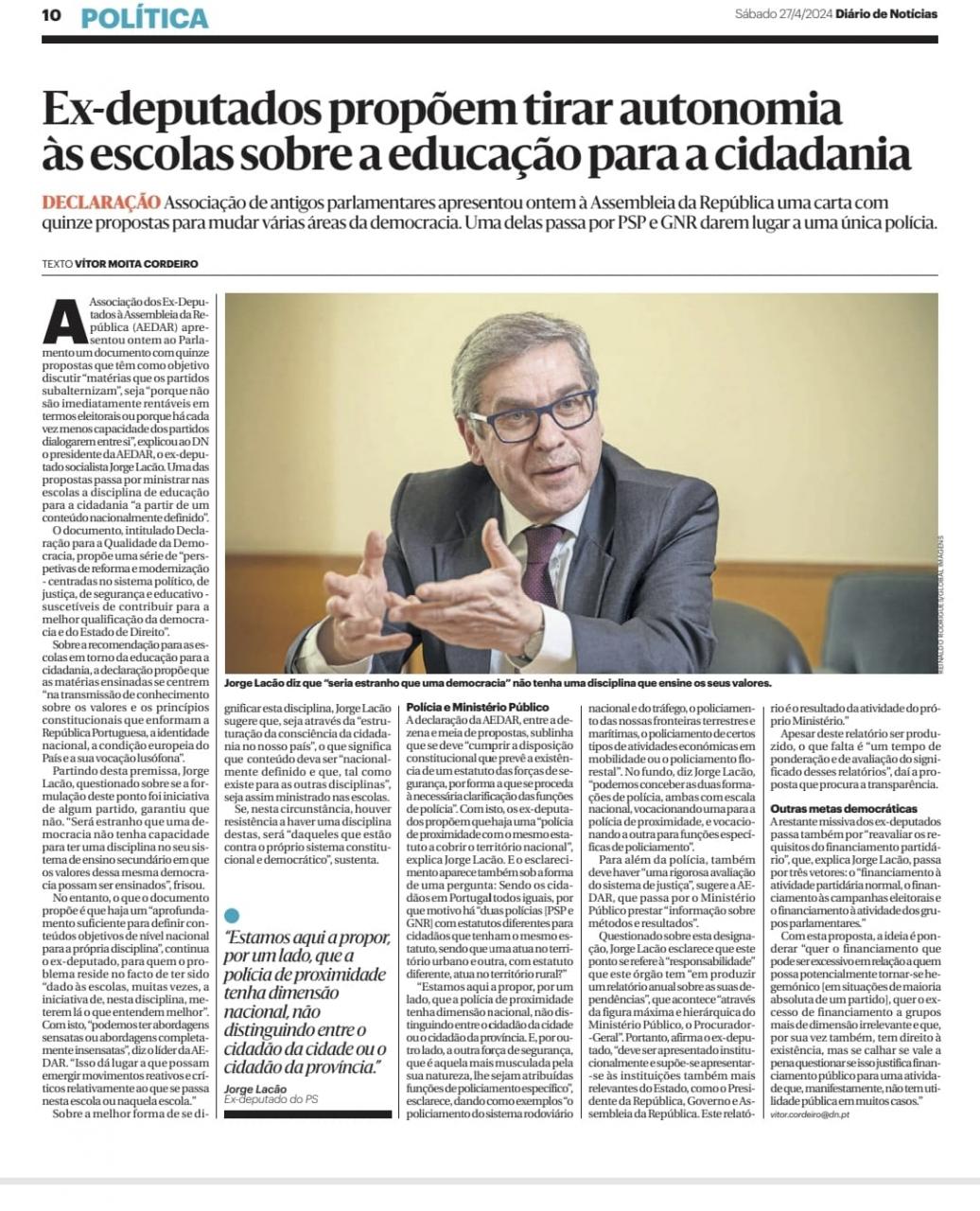 " Ex- deputados propõem tirar autonomia às escolas sobre educação para a cidadania"- Diário de Noticías de 27/04/2024